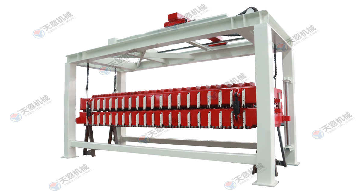 成品分垛吊機(jī):將蒸養(yǎng)車上的一模坯體吊運(yùn)至掰板輸送機(jī)上,然后將空側(cè)板吊運(yùn)至蒸養(yǎng)車上;切割工段空翻脫模機(jī)將??蚍D(zhuǎn)90°,放在切割小車支座上進(jìn)行脫模,脫模后的??蚺c清理后的側(cè)模板進(jìn)行合模,合膜后的空??虮坏?..